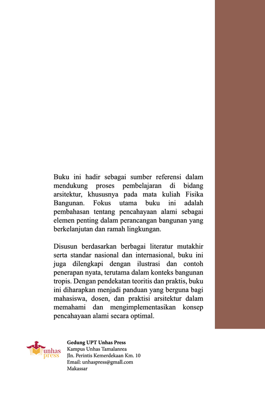 Disusun berdasarkan berbagai literatur mutakhir serta standar nasional dan internasional, buku ini juga dilengkapi dengan ilustrasi dan contoh penerapan nyata, terutama dalam konteks bangunan tropis. Dengan pendekatan teoritis dan praktis, buku ini diharapkan menjadi panduan yang berguna bagi mahasiswa, dosen, dan praktisi arsitektur dalam memahami dan mengimplementasikan konsep pencahayaan alami secara optimal.