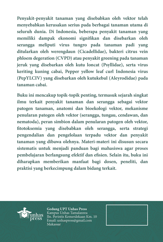 Buku ini mencakup topik-topik penting, termasuk sejarah singkat ilmu terkait penyakit tanaman dan serangga sebagai vektor patogen tanaman, anatomi dan bioekologi vektor, mekanisme penularan patogen oleh vektor (serangga, tungau, cendawan, dan nematoda), peran simbion dalam penularan patogen oleh vektor, fitotoksemia yang disebabkan oleh serangga, serta strategi pengendalian dan pengelolaan terpadu vektor dan penyakit tanaman yang dibawa olehnya.