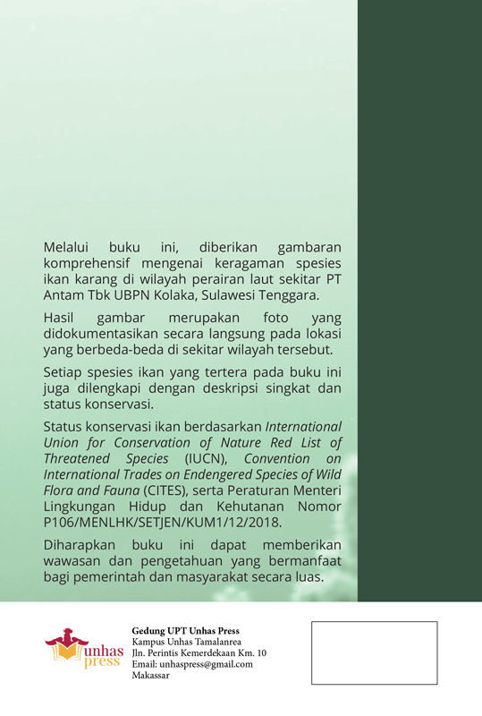 Melalui buku ini, diberikan gambaran komprehensif mengenai keragaman spesies ikan karang di wilayah perairan laut sekitar PT Antam Tbk UBPN Kolaka, Sulawesi Tenggara.