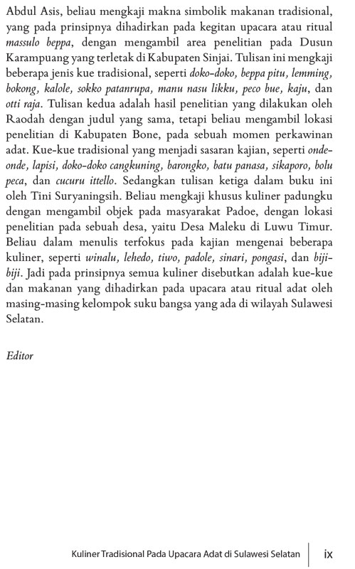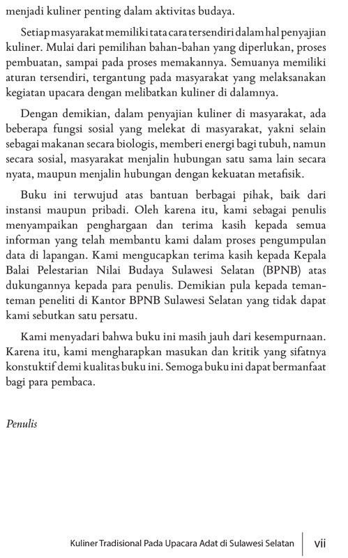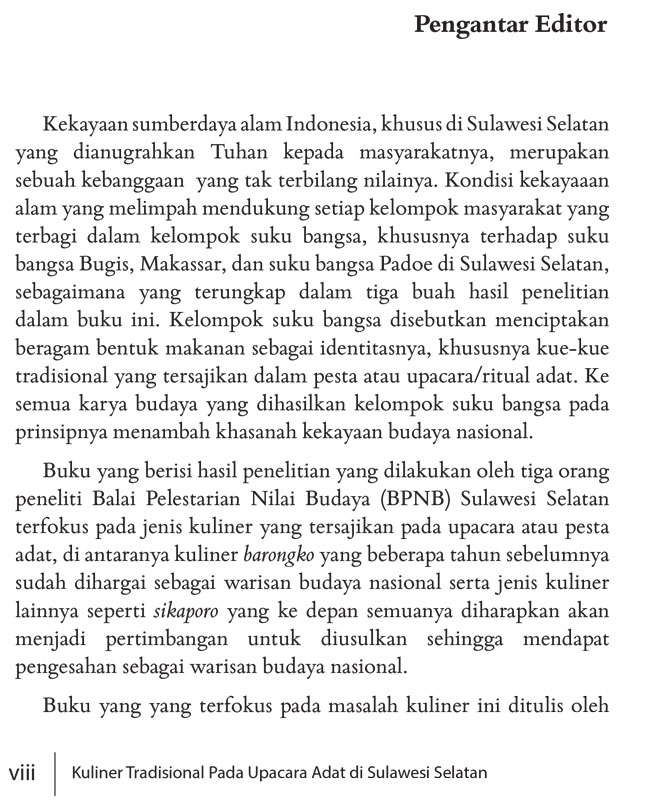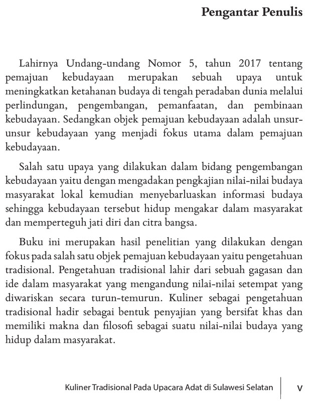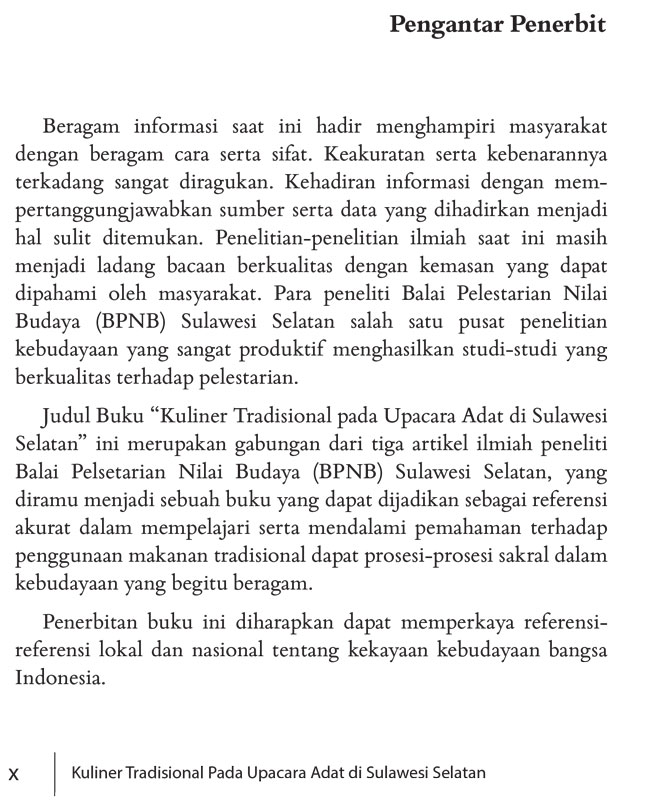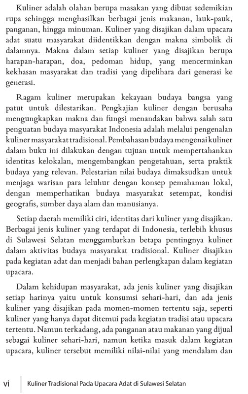 Ragam kuliner merupakan kekayaan budaya bangsa yang patut untuk dilestarikan. Pengkajian kuliner dengan berusaha mengungkapkan makna dan fungsi menandakan bahwa salah satu penguatan budaya masyarakat Indonesia adalah melalui pengenalan kuliner dalam buku ini.