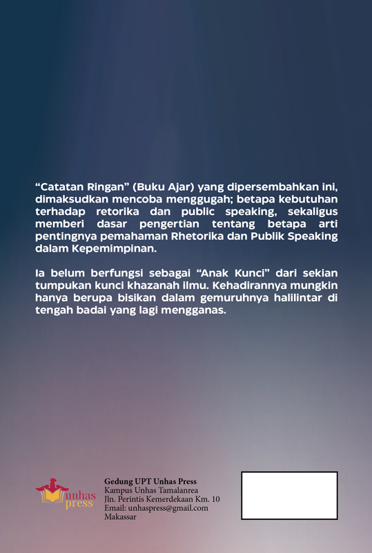 “Catatan Ringan” (Buku Ajar) yang dipersembahkan ini, dimaksudkan mencoba menggugah; betapa kebutuhan terhadap retorika dan public speaking, sekaligus memberi dasar pengertian tentang betapa arti pentingnya pemahaman Rhetorika dan Publik Speaking dalam Kepemimpinan.