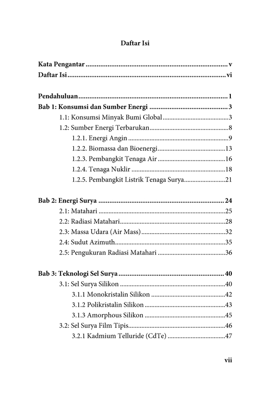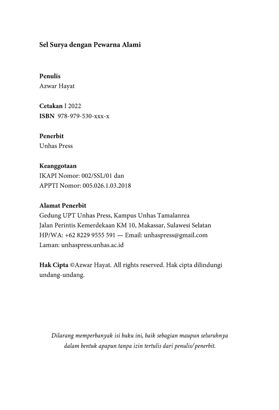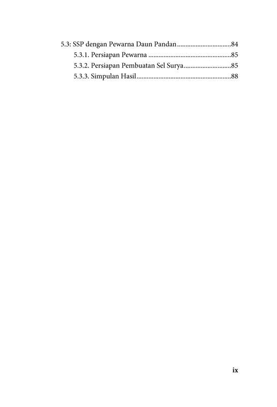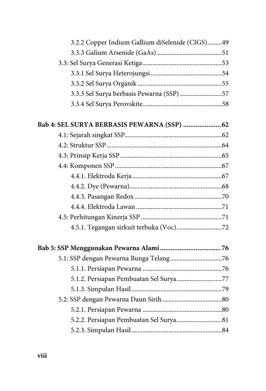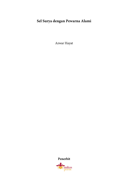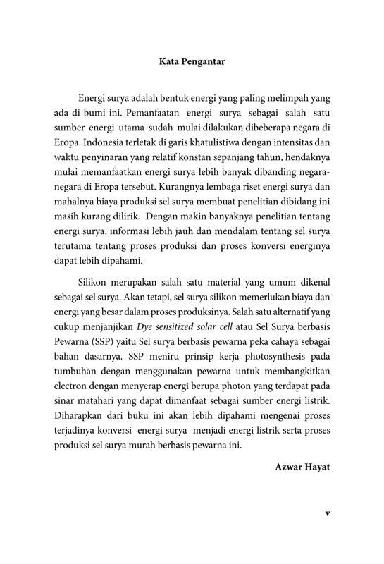 Silikon merupakan salah satu material yang umum dikenal sebagai sel surya. Akan tetapi, sel surya silikon memerlukan biaya dan energi yang besar dalam proses produksinya. Salah satu alternatif yang cukup menjanjikan Dye sensitized solar cell atau Sel Surya berbasis Pewarna (SSP) yaitu Sel surya berbasis pewarna peka cahaya sebagai bahan dasarnya. SSP meniru prinsip kerja photosynthesis pada tumbuhan dengan menggunakan pewarna untuk membangkitkan electron dengan menyerap energi berupa photon yang terdapat pada sinar matahari yang dapat dimanfaat sebagai sumber energi listrik. Diharapkan dari buku ini akan lebih dipahami mengenai proses terjadinya konversi energi surya menjadi energi listrik serta proses produksi sel surya murah berbasis pewarna ini.